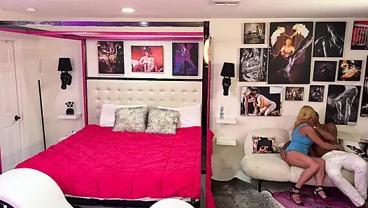 Naughty girl strokes her big clit as a huge cock thrusts her cunt